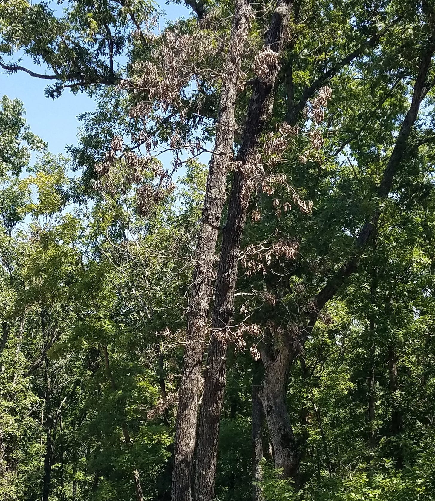 Something spread through the forest in recent years, killing several trees, mostly red oaks. One of the dead trees fell on our shed, leaving an ugly, crumpled dent across the roof on both sides, and a partially collapsed wall. A beautiful, bifurcated tree by the motorhome died. We had it professionally removed piece-by-piece. The tree debris in our sanctuary was so extensive my husband described it as “horrifying.” He has worked many hours to clear the aftermath of dead trees and there are several more still waiting to be brought down. Disease, death, and storms left ugliness behind.